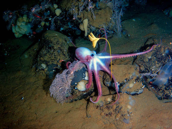 In the deep-sea realm, the Muusoctopus genus of octopuses is a true global traveller. Originating in the North Atlantic, these small to medium-sized octopuses have spread to the North Pacific, with separate invasions populating the Southern Hemisphere. Take Muusoctopus profundorum (pictured), for instance, found tending a vibrant garden near a Bering Sea volcano 2,745 m (9,000 ft.) below the surface, showcasing colourful tunicates and crinoids. It’s like discovering an octopus with a green thumb!